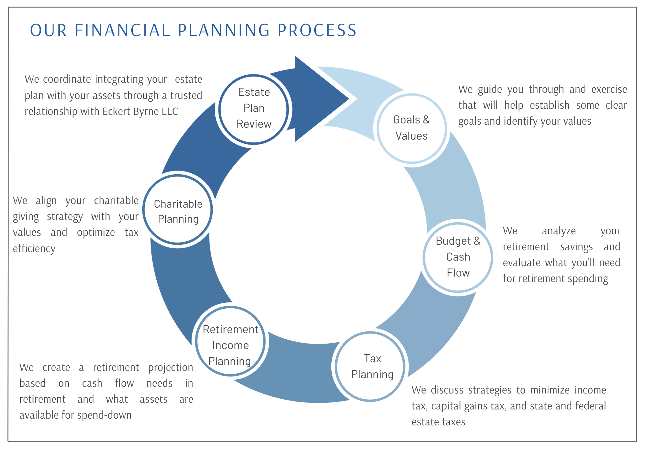 We develop strategies to minimize tax liabilities, design a retirement income plan that supports your lifestyle, and align your charitable giving with both your values and tax efficiency. Finally, we integrate your estate plan with your overall financial picture through our trusted partnership with Eckert Byrne LLC. The result is a coordinated, personalized plan that evolves with your life, helping you make informed decisions and stay on track.